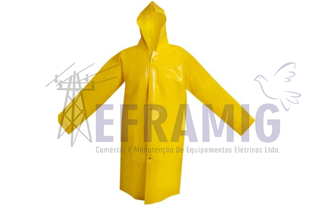 Capa de Chuva confeccionada em PVC com forro de poliéster.Mangas longas, capuz, fechamento frontal com quatro botões plásticos de pressão. Disponível em diversos tamanhos.
